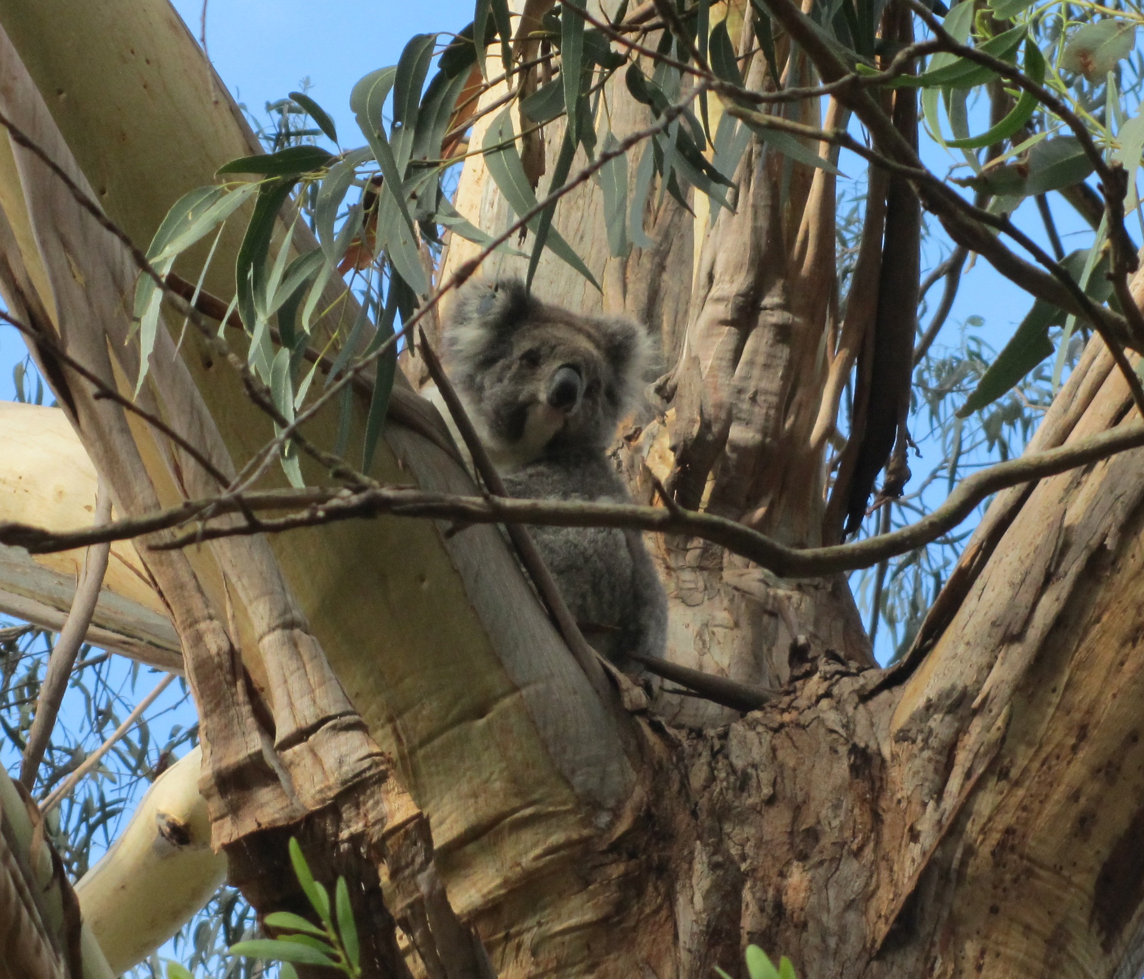 Well fortified, we ventured along, trying to not get our hopes up too high for our next stop. The guides all mentioned a spot along the road by Kennett River where koalas were easier to find than a cupcake in Clarendon. Once again, going three for three, we sighted koalas right away. The first two we saw were swarmed by other tourists and they were both sleeping so they looked like lumps in a tree. We decided to drive a bit further and got super lucky, seeing this guy straight away.