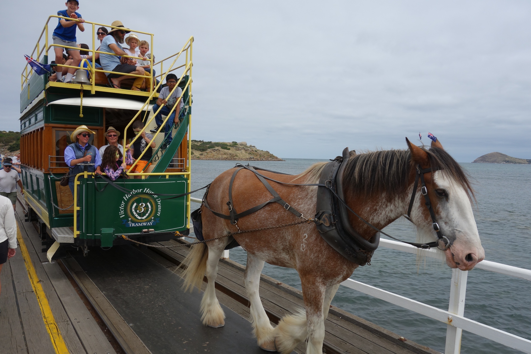 We had a scheduled ferry ride to Kangaroo Island at 7pm, so even after covering the last 500km of our trip, we had some time to kill, so we decided to stop in a town near the ferry terminal – Victor Harbor. They had a nice waterfront area including the first horse drawn tram I’d ever seen. We did a nice hike and got a late lunch / early dinner before heading over to the ferry.