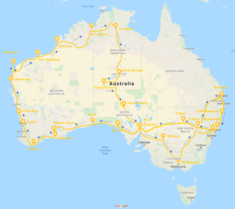 We’d planned to fly back to the US less than 2 weeks from now, but instead we’re staying put in Brisbane for the foreseeable future.  So with some of my endless free time, I put together a few stats from our road trip and a final map showing our whole route.